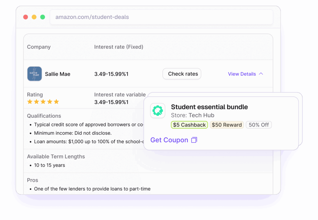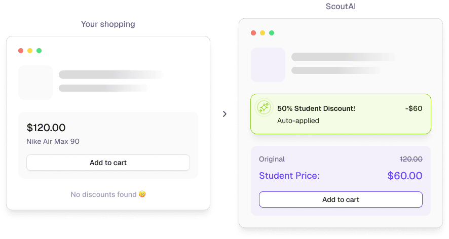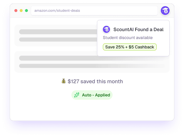 ScoutAI finds exclusive student discounts and cash-back offers automatically as you browse — no coupon hunting, no forms, no stress.