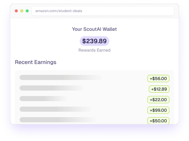 ScoutAI tracks every eligible action — from claiming a student discount to referring a friend — and adds real dollars to your wallet. Withdraw anytime. No gimmicks.